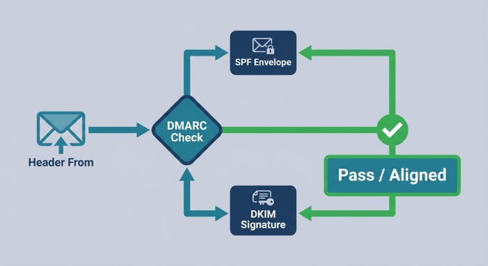 - DMARC evaluates alignment between the visible Header From domain and an authenticated identifier from SPF or DKIM.