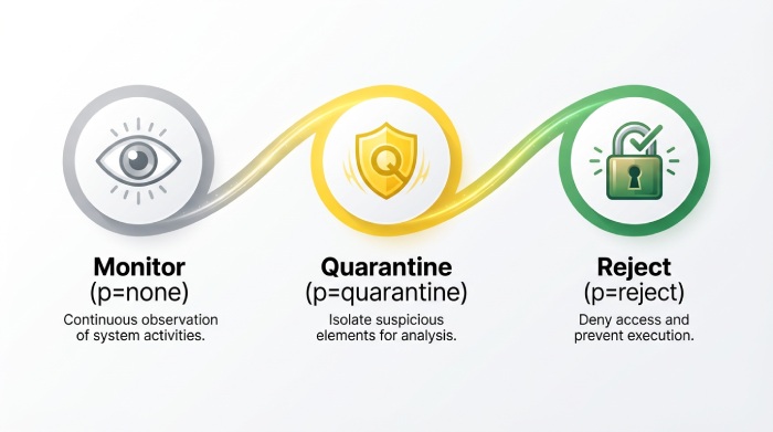 Implementation: From monitor (p=none) to quarantine and reject, step-by-step