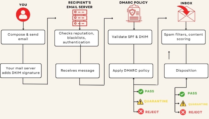 DMARC is built on SPF and DKIM by providing a way for domain owners to specify how receiving servers should handle emails that fail authentication. A domain owner creates a DMARC policy in the domain’s DNS settings, specifying whether to allow, quarantine, or reject emails that fail SPF and/or DKIM checks**. You can also adjust the percentage of the policy tag by observing the number of false positives and false negatives. If you receive too many of these reports and are fed up with managing them effectively, then we can help you with this. We will monitor these reports and send you aggregated versions. To know more about our services, reach out to us. Meanwhile, you can also check out our resources to learn more about email authentication.