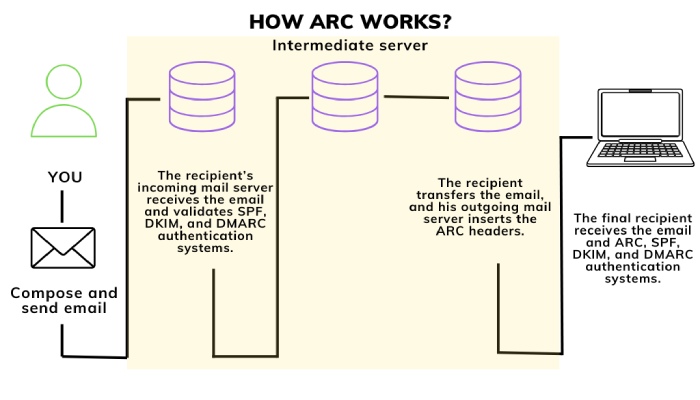 So when the recipient receives the forwarded email that has failed DMARC, the server refers to the ARC to validate the email again or, more like, give it the benefit of the doubt to cross-check if the **mail was authenticated before the intermediary server stepped in and forwarded further.