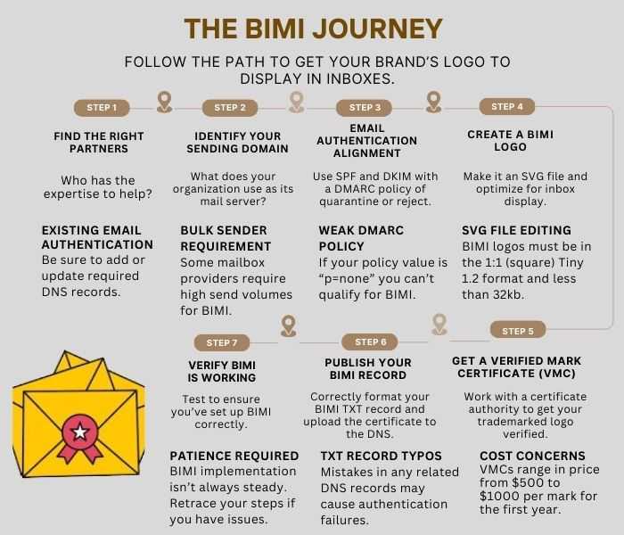 Creating a BIMI record:_ Next, you must create a BIMI record for your domain. It will include a reference to a publicly accessible SVG (your brand logo). You must host the logo file on a secure server and publish the BIMI record in your domain’s **DNS records. 3. Verifying your Domain and Logo: After publishing the DMARC policy and BIMI record, the next step is verifying the domain and logo to ensure they meet **BIMI standards. 4. Testing your BIMI Implementation: Next, you must _test your BIMI implementation to ensure everything works how you want. You can send test emails to different clients and check if they display your logo correctly.